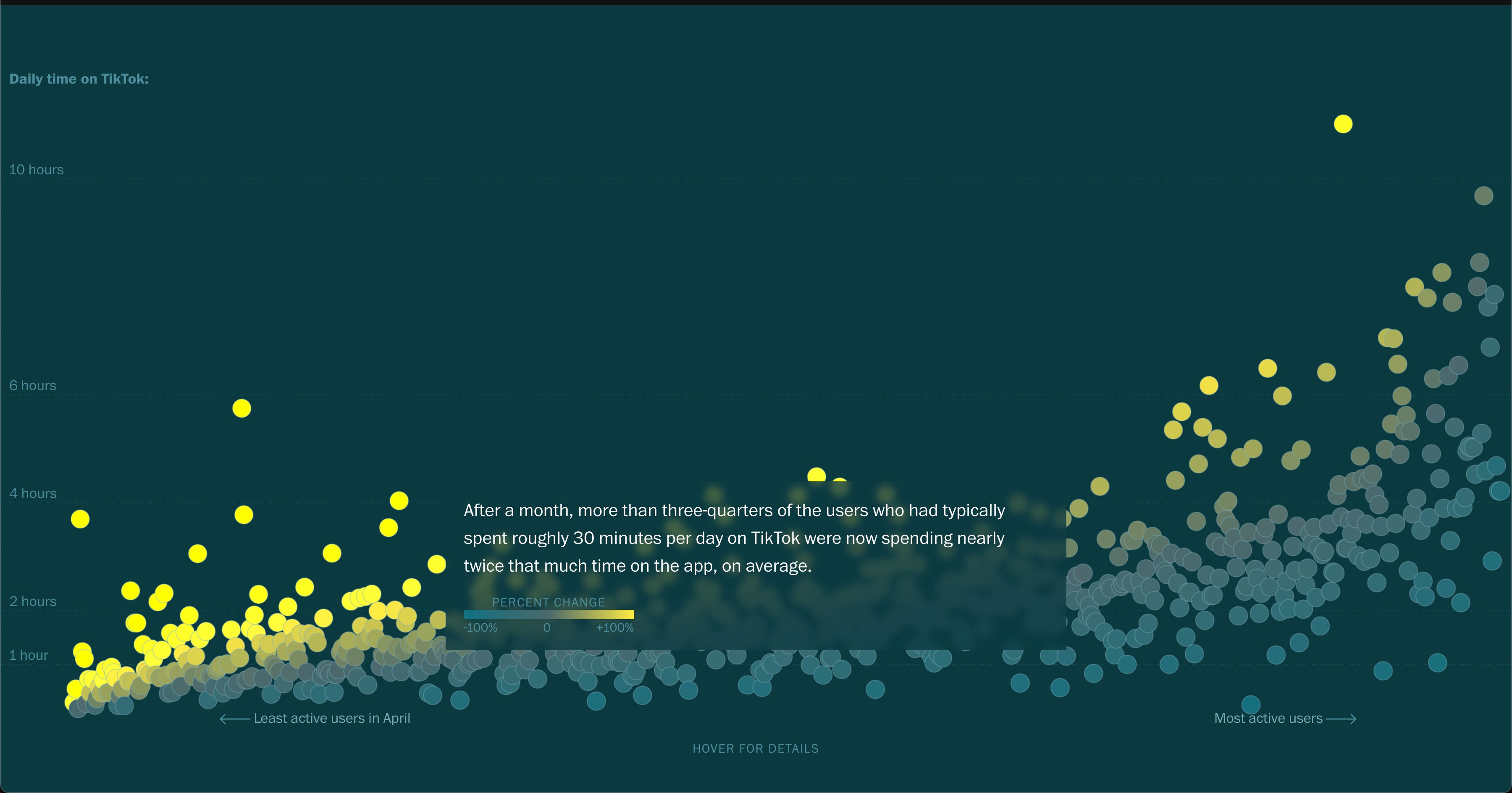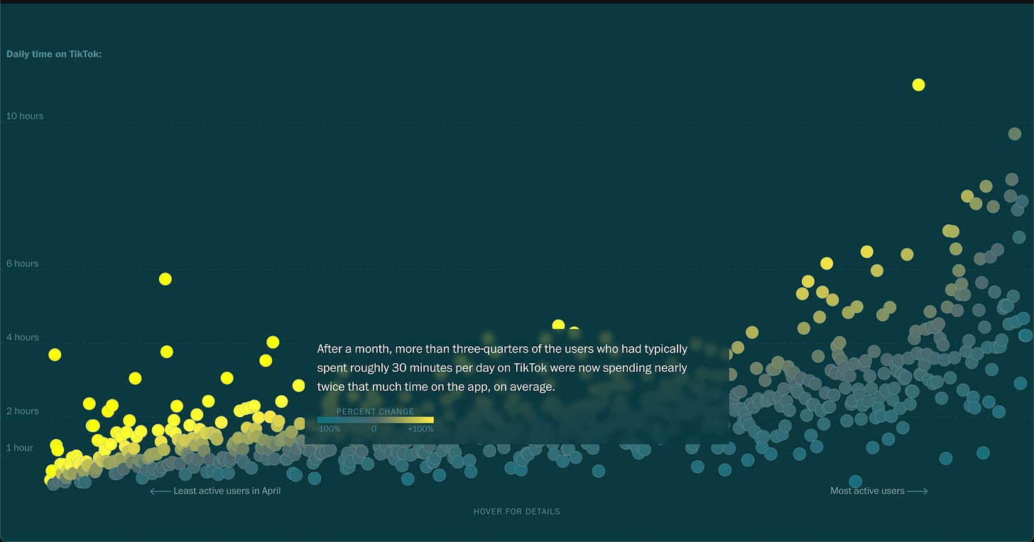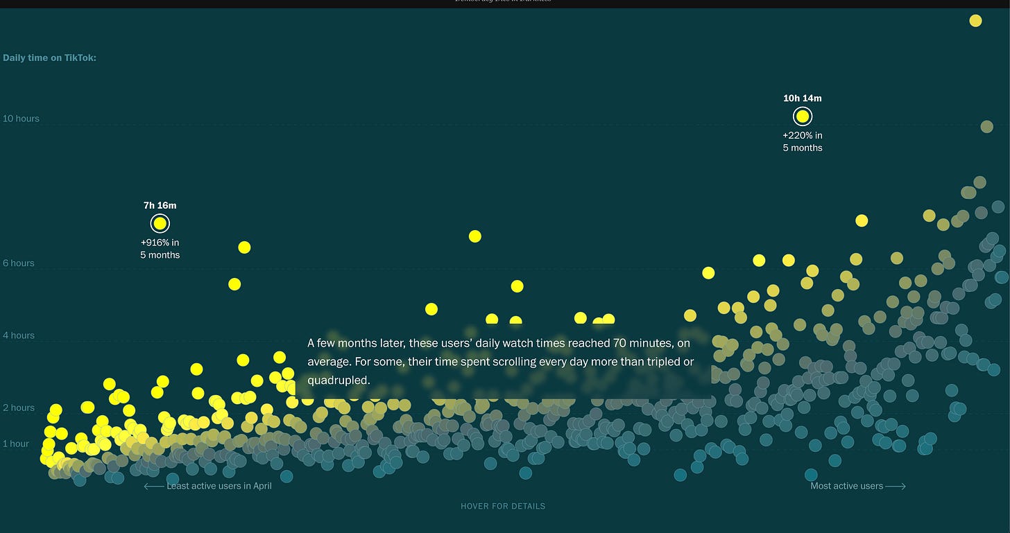 Want proof of our voracious appetites? The Washington Post analyzed ~1,100 TikTok watch histories: in five months, some users’ daily watch time rose +916%, with the heaviest hitting over ten hours. On average, light users more than doubled to ~70 minutes/day.