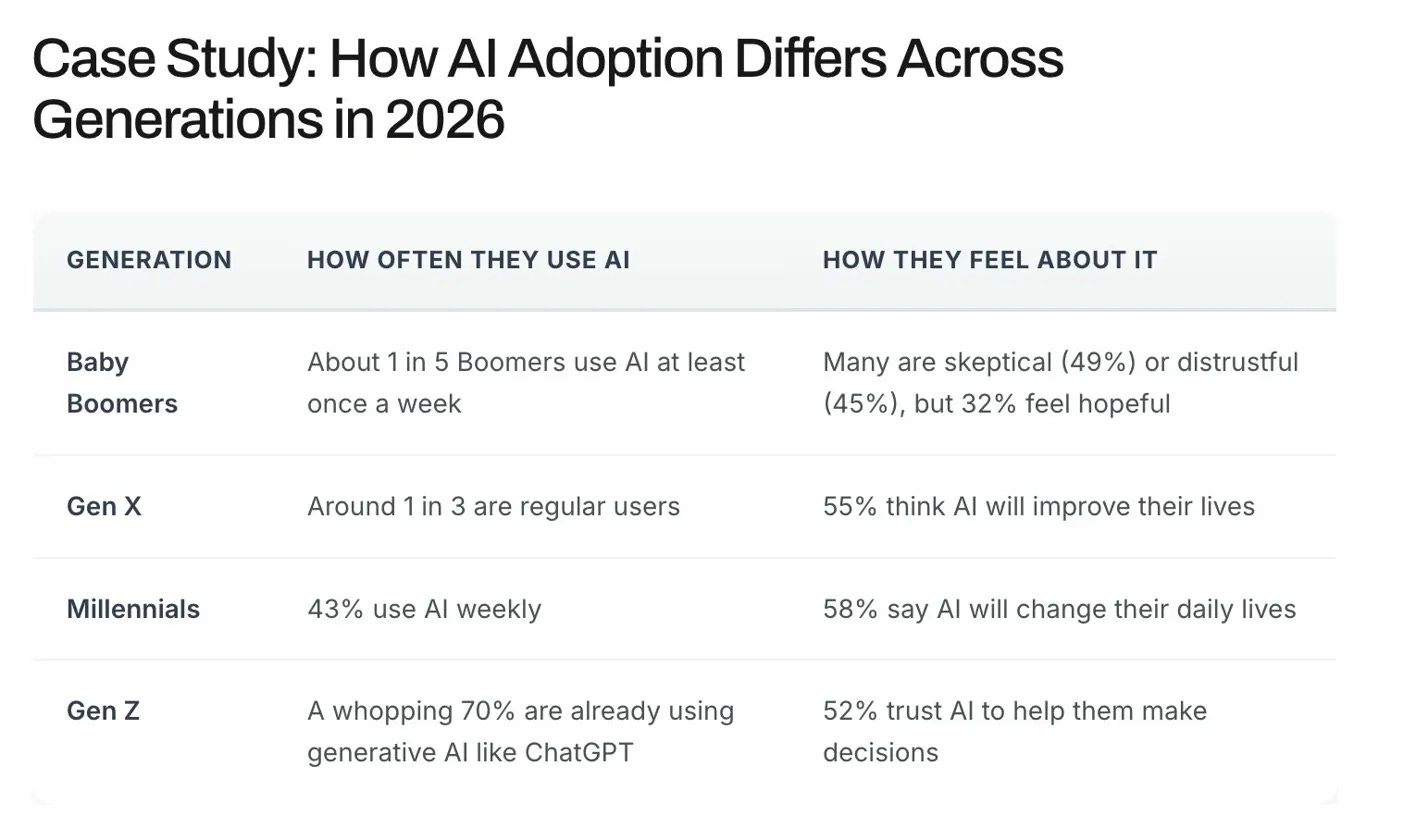Let’s take the young bucks: Gen Z. Seventy percent already use generative AI weekly. Over half trust this alien technology to help them make real-life decisions.1