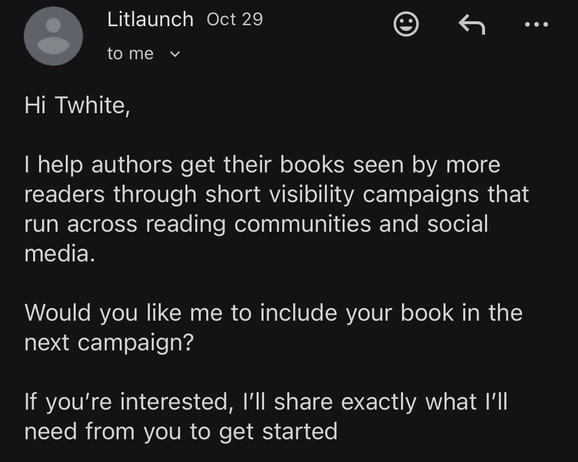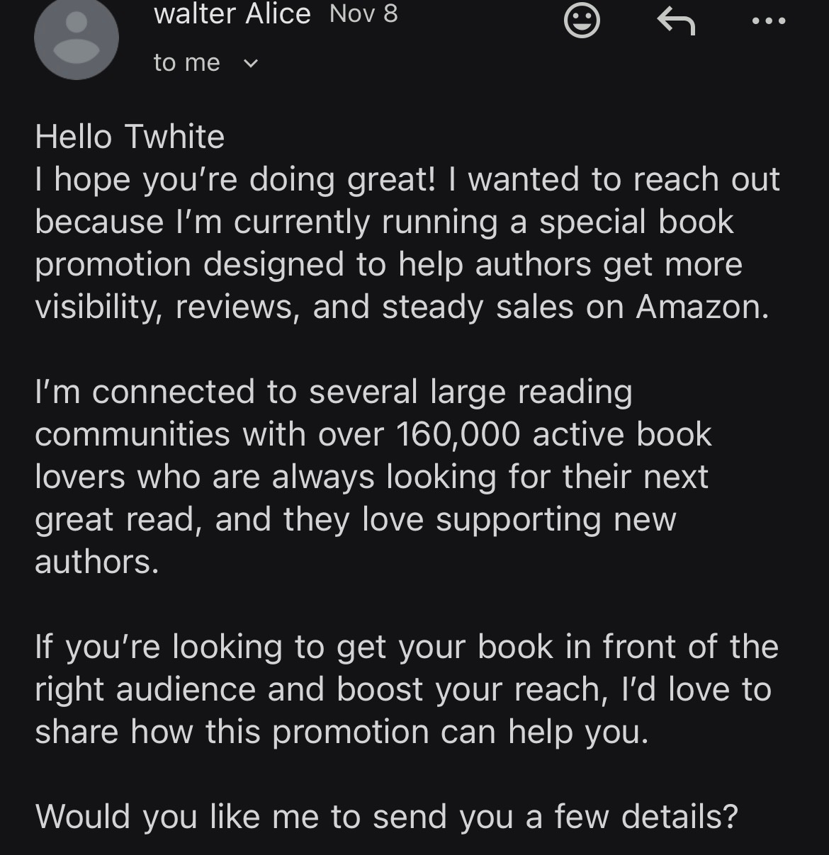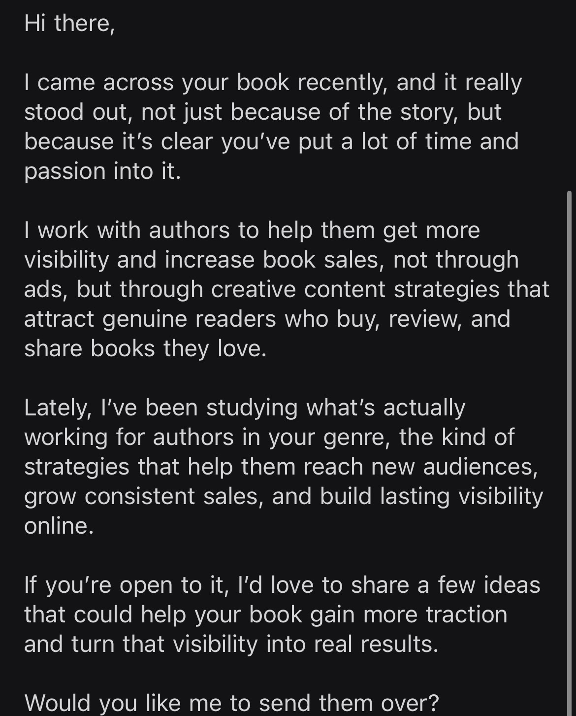 I get literally dozens like the ones below. “Loved your book! I want to help you market it!” They’re the modern Sirens (half as talented and not nearly as beautiful) — singing manufactured flattery in a key calibrated to trap any author unlucky enough to drift too close and lend an ear.