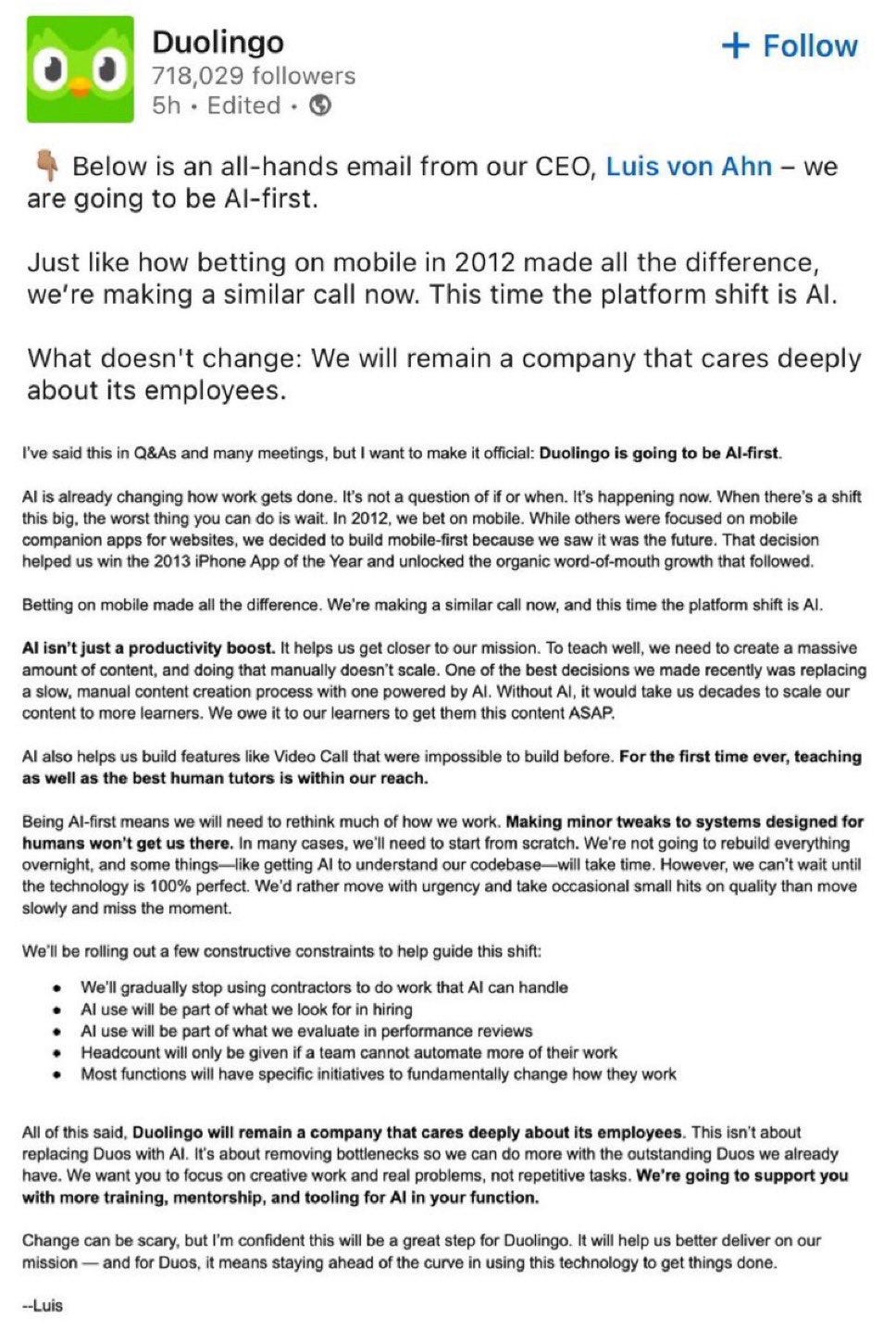 Duolingo CEO Luis von Ahn recently told his employees: "AI isn't just a productivity boost...Being AI-first means we will need to rethink much of how we work." His constraints included: "Headcount will only be given if a team cannot automate more of their work.”